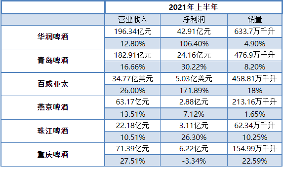 2021年上半年啤酒集團(tuán)啤酒銷量及營收利潤明細(xì)表