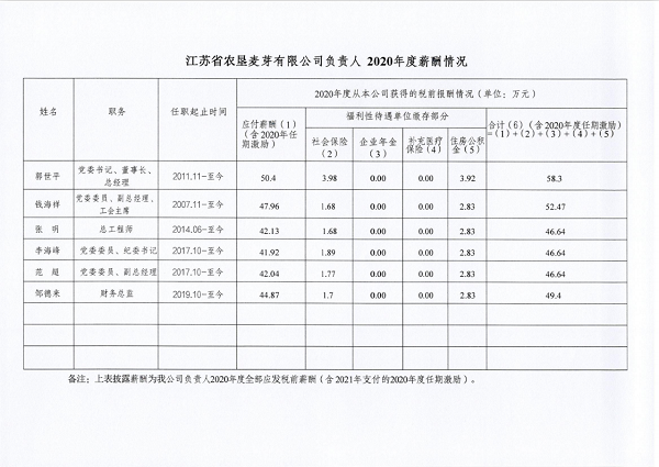 江蘇省農(nóng)墾麥芽有限公司負責人2020年度薪酬情況