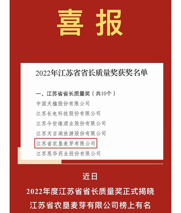 9月17日,2022年江蘇省省長質(zhì)量獎獲獎企業(yè)名單正式公布,江蘇省農(nóng)墾麥芽有限公司榜上有名,成為2022年度鹽城市唯一一家江蘇省省長質(zhì)量獎獲得者。